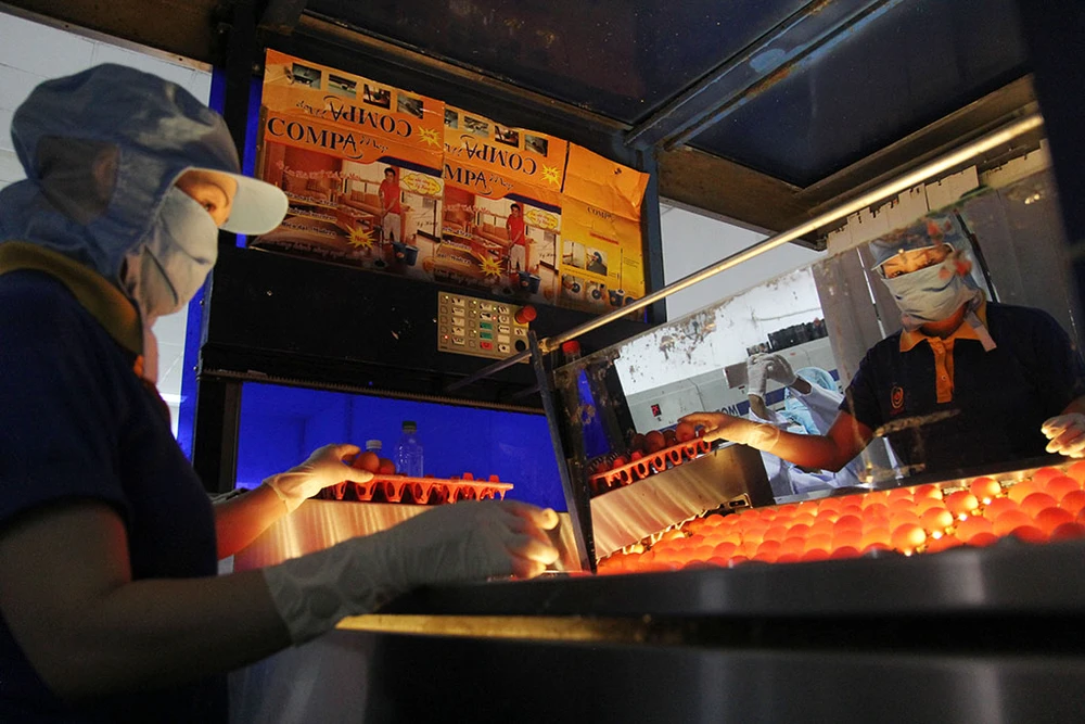 Công đoạn kiểm tra để loại bỏ các trứng hư hỏng trong nhà máy xử lý trứng gia cầm Ba Huân. Ảnh: HOÀNG GIANG