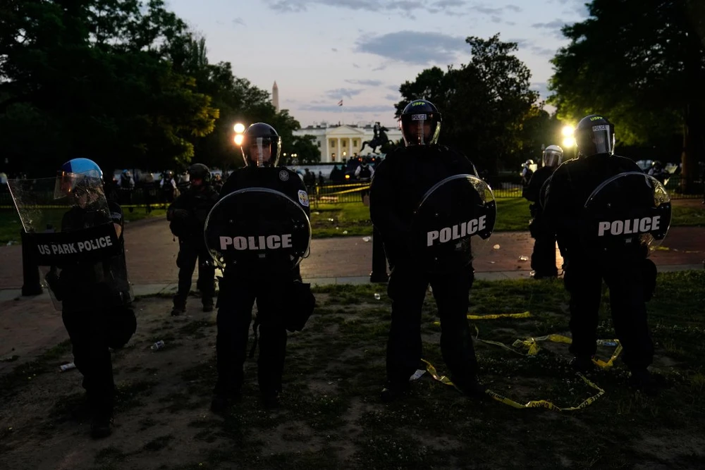 Các nhân viên an ninh tập hợp thành hàng rào bảo vệ Nhà Trắng vào rạng sáng 30-5. Ảnh: AP