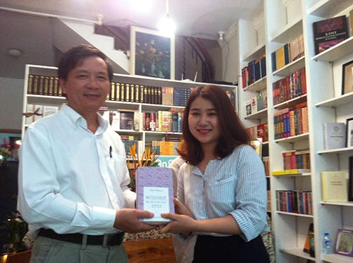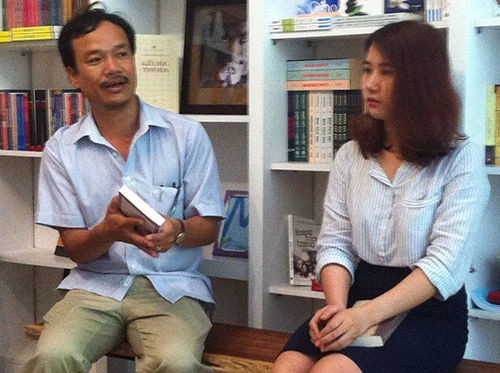 Nhà thơ Lý Đợi (trái) giới thiệu về tác phẩm. Chủ nhà sách Ango cũng nói rằng sẽ giảm giá 40 % cho sinh viên