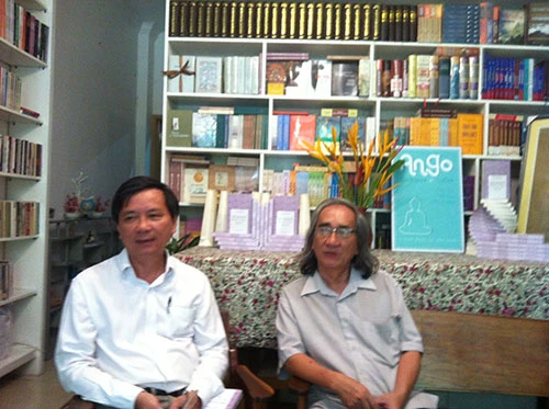 PGS-TS Đoàn Lê Giang và nhà nghiên cứu Nhật Chiêu (phải) tại buổi trao tặng sách. Ảnh N.TÝ