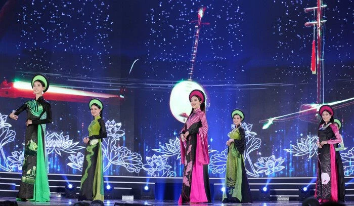 Nhóm thí sinh trình diễn bộ áo dài tôn vinh di sản âm nhạc Nam bộ đờn ca tài tử. Ảnh: internet