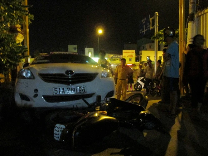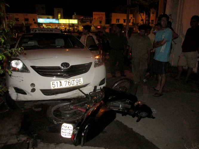 Tại hiện trường, phần đầu xe taxi Vinasun bị móp méo. Chiếc xe máy Sirius đỏ đen bị hư hỏng nặng.