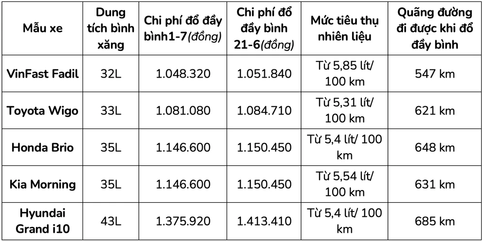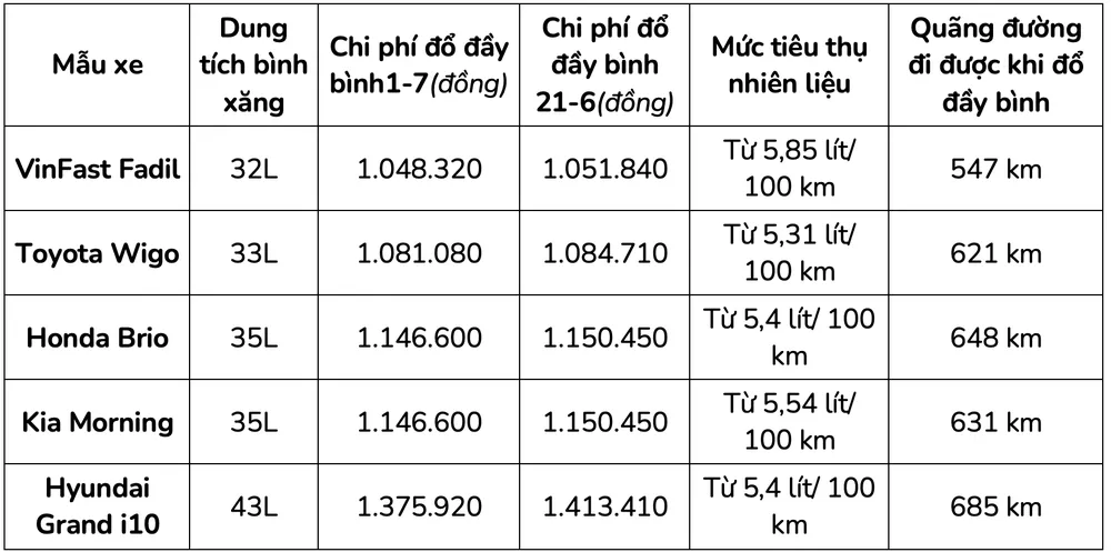 Dưới đây là chi phí đổ đầy bình xăng cho các dòng xe phân khúc A: