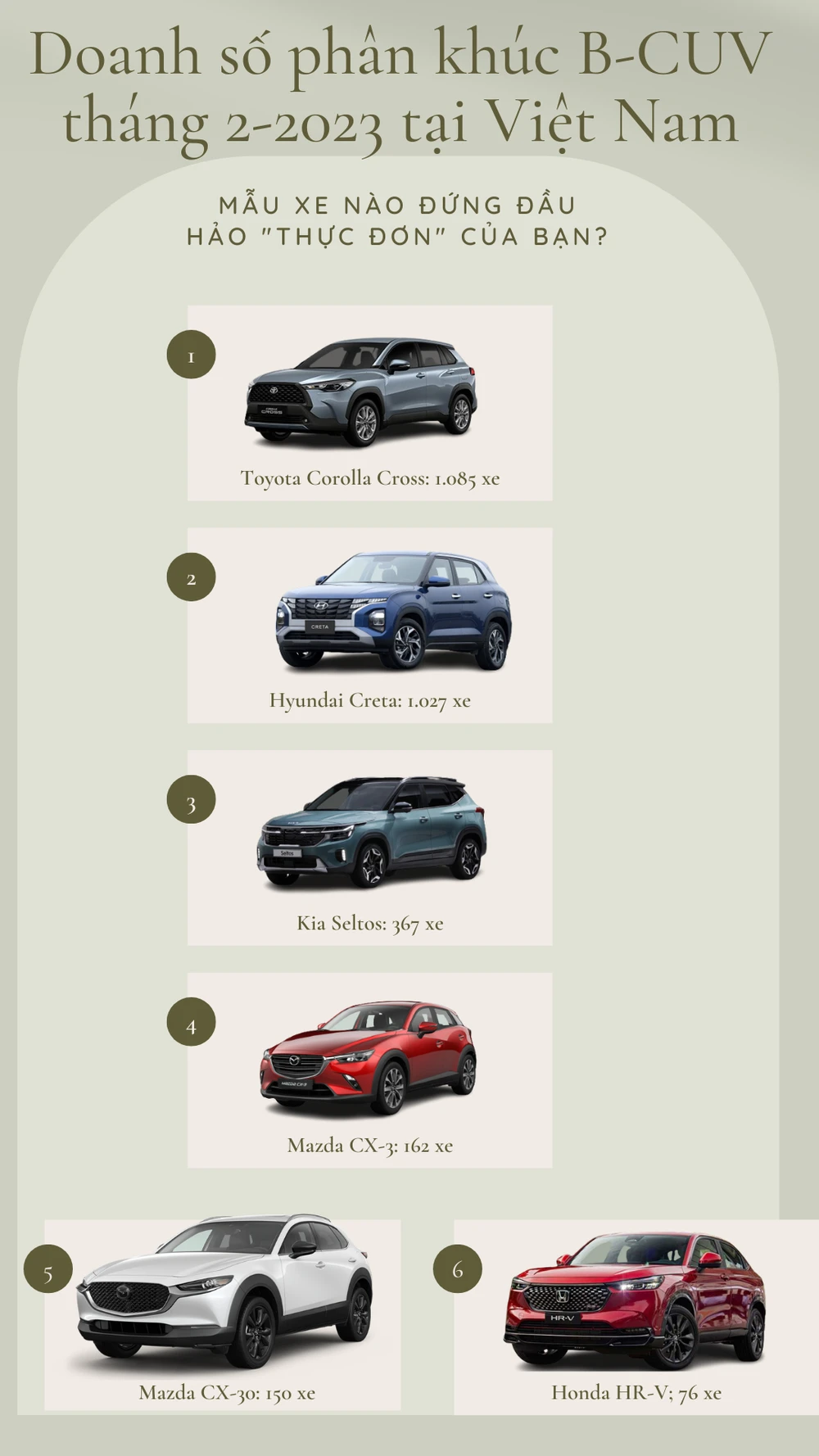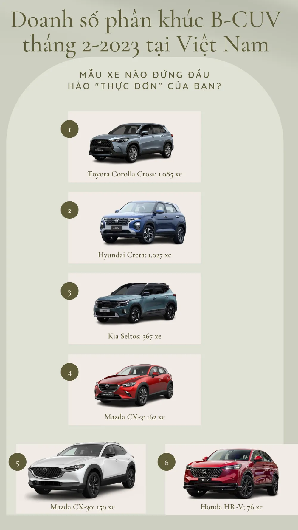 (PLO)- Theo báo cáo bán hàng của Hiệp hội Các nhà sản xuất ô tô Việt Nam (VAMA) và TC Motor, trong tháng 2, phân khúc B-CUV đã có sự khởi sắc về doanh số, chỉ có Toyota Corolla Cross vẫn duy trì vị trí bán chạy nhất phân khúc.