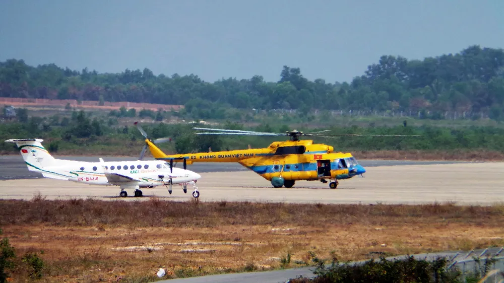 Chiếc máy bay màu trắng của bầu Đức dừng cạnh trực thăng cứu hộ. Ảnh: Huy Trần