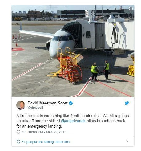 Nhà chiến lược marketing nổi tiếng David Meerman Scott cũng có mặt trên chuyến bay này. Ông viết trên Twitter: "Chúng tôi đã va phải ngỗng trời và những phi công tài năng đã đưa chúng tôi hạ cánh khẩn cấp."