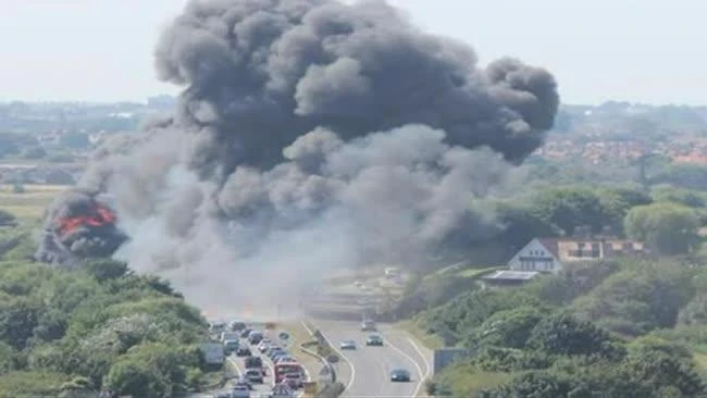 Chiếc máy bay phản lực Hawker Hunter lúc đó đang tham gia vào màn trình diễn lộn vòng trên bờ biển Đông Nam nước Anh thì rơi xuống con đường chính đông đúc tiếp giáp với sân bay Shoreham ở Sussex, va vào một vài chiếc xe trên đường, tạo ra một quả cầu lửa với khói đen cuồn cuộn bốc lên bầu trời.