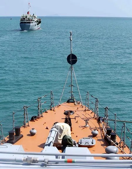 Tàu cứu hộ HQ 627 của Vùng 5 Hải quân rời căn cứ Phú Quốc lúc 16 giờ ngày 10-3. Ảnh: XUÂN HUY