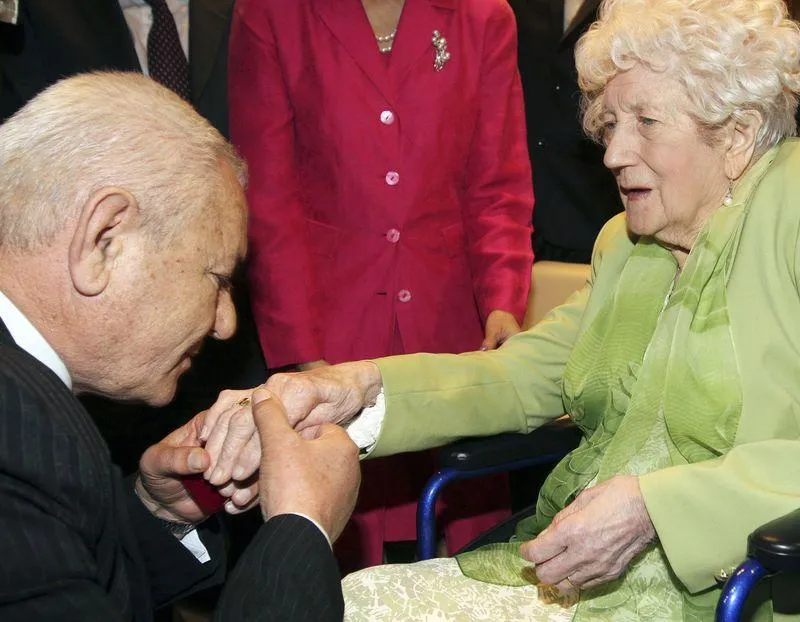 Ông Xhemil Cala đeo chiếc nhẫn lên tay bà Dorothy Webster, em gái Hạ sĩ John Thompson vào lễ tưởng niệm vào ngày 9-3-2015.
