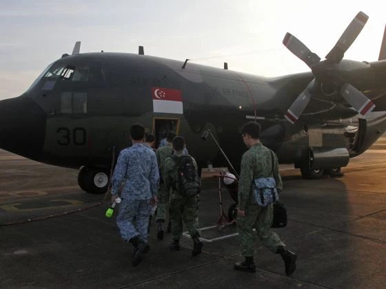 Lực lượng cứu hộ Singapore chuẩn bị lên chiếc C-130 để tìm kiếm.
