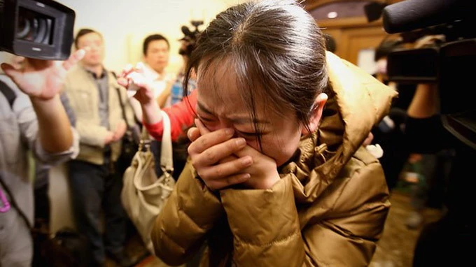 Người thân của hành khác đi trong chuyến bay MH370 đang ở sân bay Bắc Kinh - Ảnh: Reuters