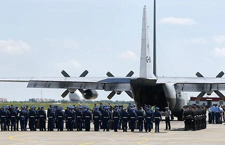 Hai máy bay vận tải quân sự của Hà Lan và Úc đưa 40 thi thể cất cánh từ sân bay Kharkov (Ukraine) về căn cứ không quân ở TP Eindhoven (Hà Lan) để làm thủ tục nhận dạng.
