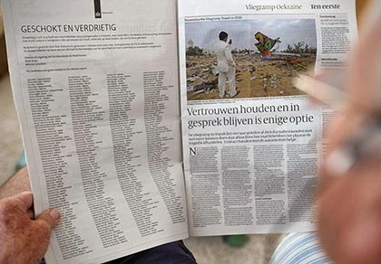 Báo De Volkskran (Hà Lan) đăng nguyên trang đầy đủ tên các nạn nhân tai nạn máy bay MH17. Ảnh: GETTY IMAGES