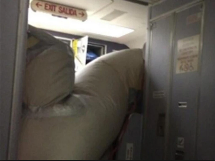 Chiếc thang phao cứu hộ bung ra choán hết bên trong lòng chiếc Boeing. Ảnh: CBS