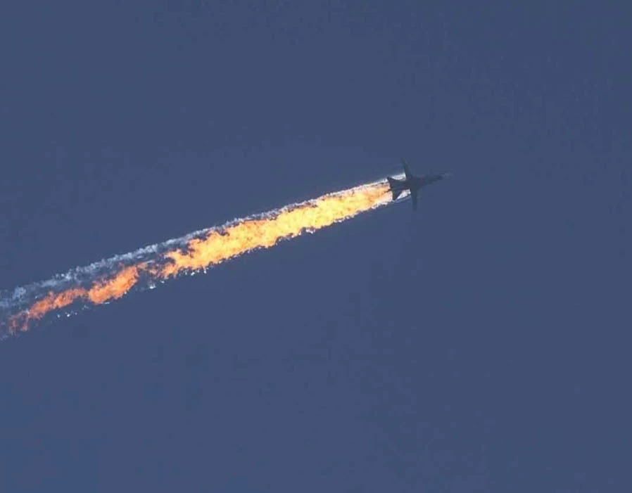 Máy bay Su-24 của Nga bị Thổ Nhĩ Kỳ bắn cháy ngày 25-11. Ảnh: Express/Getty