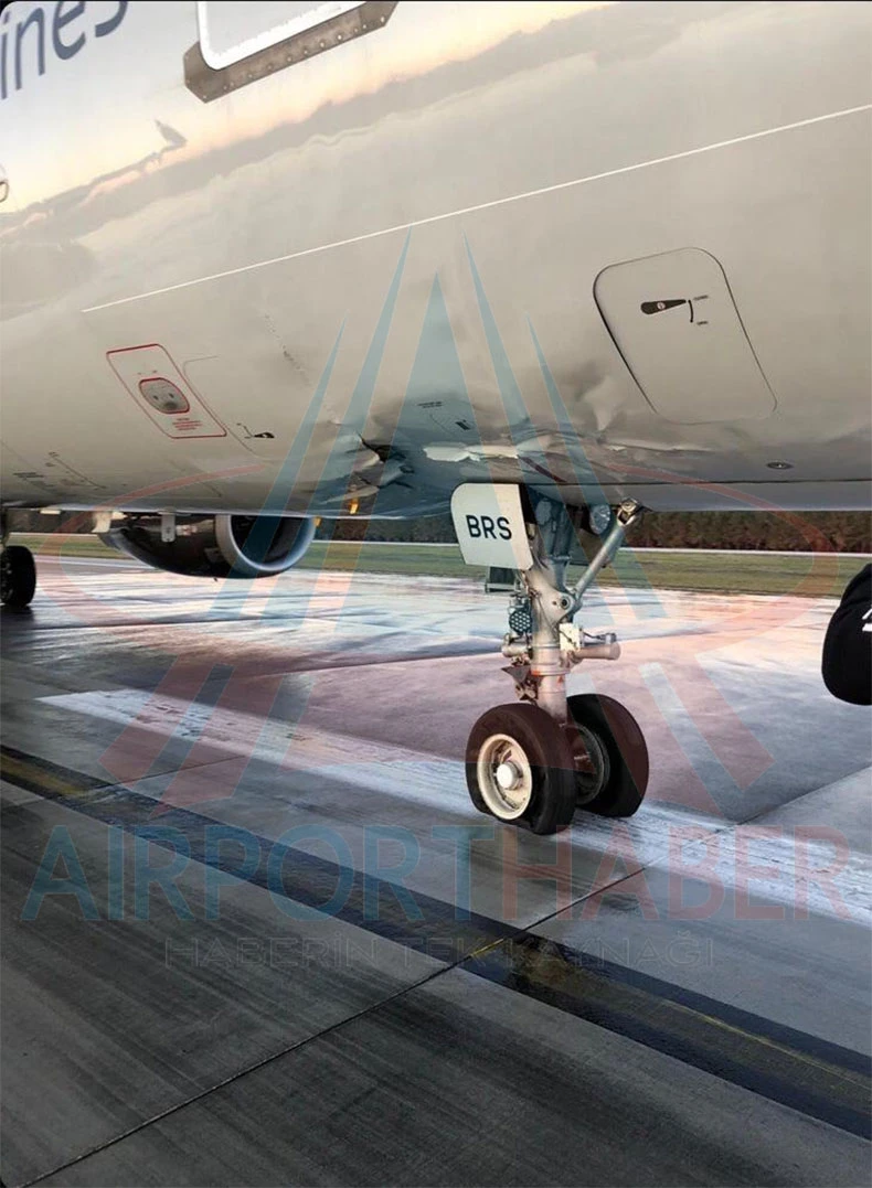 Chiếc máy bay Airbus A321-200 có số đuôi VQ-BRS của hãng hàng không Nordwind Airlines hạ cánh khẩn cấp ở TP Antalya, Thổ Nhĩ Kỳ. Phần thân máy bay bị hư hại sau khi hạ cánh. Ảnh: AIRPORTHABER
