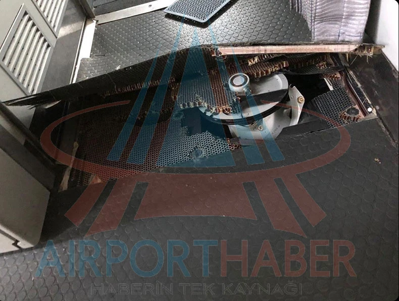 Chiếc máy bay Airbus A321-200 có số đuôi VQ-BRS của hãng hàng không Nordwind Airlines hạ cánh khẩn cấp ở TP Antalya, Thổ Nhĩ Kỳ. Phần hư hại có thể được quan sát từ bên trong máy bay. Ảnh: AIRPORTHABER