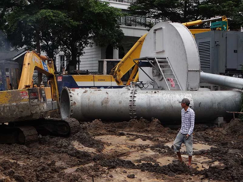 Đã sắp hết mùa mưa nhưng công trình lắp đặt máy bơm công suất lớn chống ngập đường Nguyễn Hữu Cảnh vẫn chưa hoàn thành. Ảnh: KB