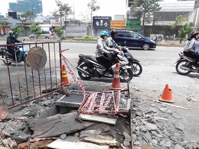 Ngoài vị trí hố đào để lắp máy bơm, Trung tâm chống ngập TP còn xác định khi thi công đào đoạn cống băng đường Nguyễn Hữu Cảnh (trước tòa nhà The Manor), tại vị trí tuyến băng ngang bằng thép đào để đấu nối vào tuyến cống thoát nước TP trước tòa nhà này cũng bị sạt lở, hở hàm ếch, ảnh hưởng đến kết cấu hệ thống cống thoát nước, đường và vỉa hè.
