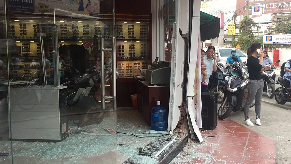 Tại hiện trường, đầu ô tô hư hỏng nặng, tường của tiệm bị nứt, khắp nơi tràn ngập mảnh kính vỡ và đồ đạc hư hỏng.