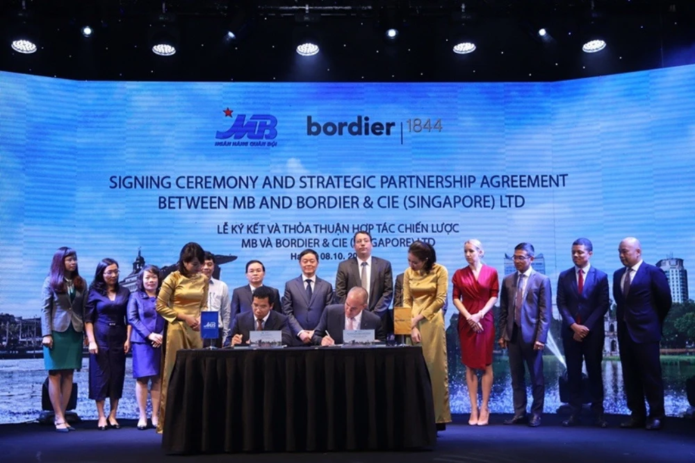 Ngày 8-10, tại khách sạn Lotte Hà Nội đã diễn ra lễ ký kết thỏa thuận hợp tác chiến lược phát triển và triển khai dịch vụ ngân hàng cá nhân cao cấp (Private Banking) giữa Ngân hàng Thương mại Cổ phần Quân Đội (MB) và Ngân hàng tư nhân Thụy Sĩ Bordier & Cie Singapore (Bordier).