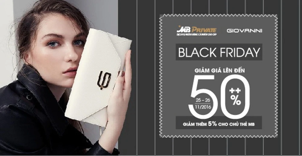 Theo đó, trong thời gian diễn ra chương trình, khách hàng cá nhân cao cấp của MB sẽ được hưởng ưu đãi: Giảm giá lên đến 50% ++ và giảm thêm 5% cho chủ thẻ MB tất cả sản phẩm. Điều kiện: Khách hàng xuất trình thẻ hoặc thanh toán qua thẻ MB để được hưởng ưu đãi (áp dụng cho tất cả hạng thẻ còn hiệu lực của MB). Địa chỉ nhận ưu đãi: Các gian hàng Giovanni Việt Nam trên toàn hệ thống. Website: giovanni-italy.com. Thông tin liên hệ: Phòng Ngân hàng cá nhân cao cấp: 0462 777 222 (0578).