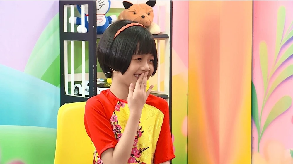 Cô bé Gia Ngân gây ấn tượng với mái tóc được cắt theo phong cách Nhật Bản, mỗi lần được MC Tuyền Tăng khen, cô bé lại lấy tay che miệng cười vô cùng bẽn lẽn.