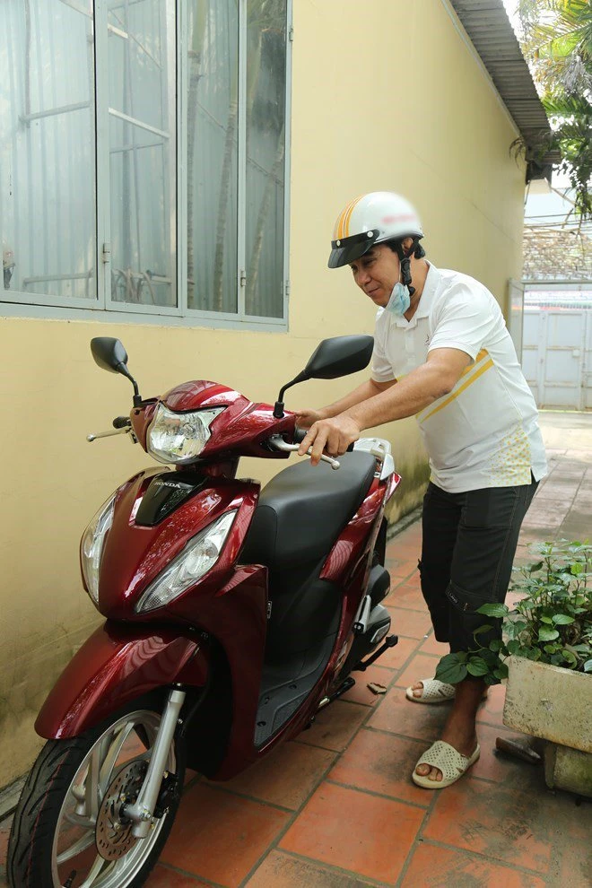 Quyền Linh mặc quần short đi dép tổ ong mang xe máy tới tặng cho nữ điều dưỡng Vũ Thị Chinh (thí sinh xuất hiện trong tập 5).