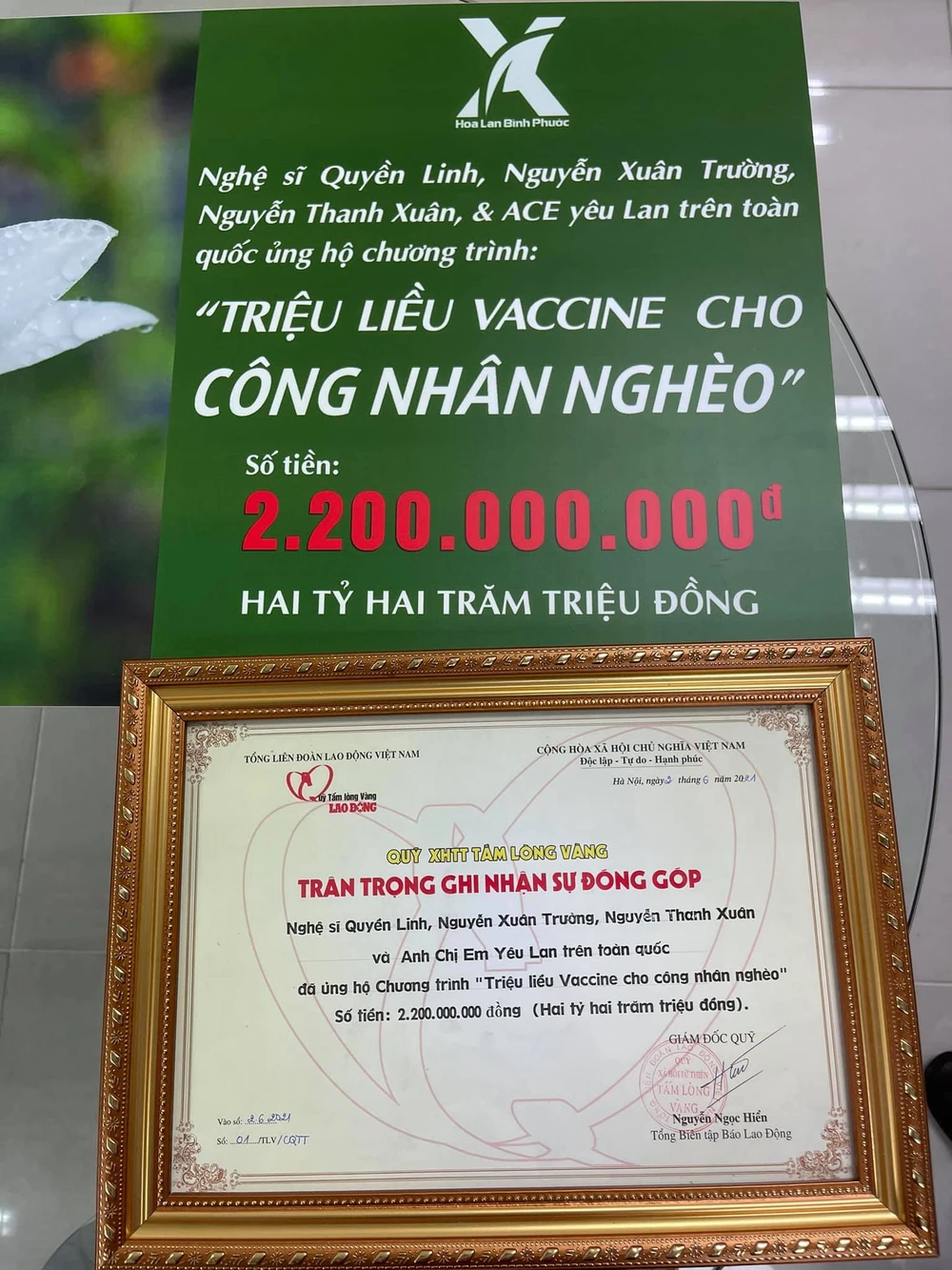 Sáng 2-6, MC Quyền Linh cùng với những người bạn của mình và hội anh em yêu hoa lan trên toàn quốc đã ủng hộ 2,2 tỉ đồng cho đại diện Trung tâm y tế TP.HCM để mua vaccine cho công nhân và người lao động nghèo.