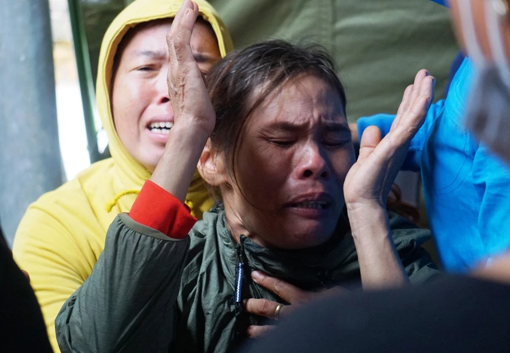 Gương mặt bà Quyên thất thần vì mất ngủ, quần áo bà lấm lem bùn đất vì trước đó bà cùng chồng lao vào hiện trường tìm con. Khi thi thể vừa tìm xong và lên xe cứu thương, vợ chồng bà cũng chạy theo đoàn xe mong nhanh chóng được nhìn mặt con.