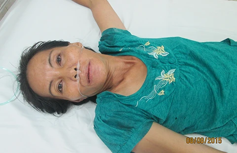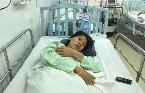 Chị Duyên - mẹ của bé trai bị đâm đang được điều trị tại BV Đa khoa tỉnh Vĩnh Long sau cú sốc kinh hoàng. Ảnh: GIA TUỆ