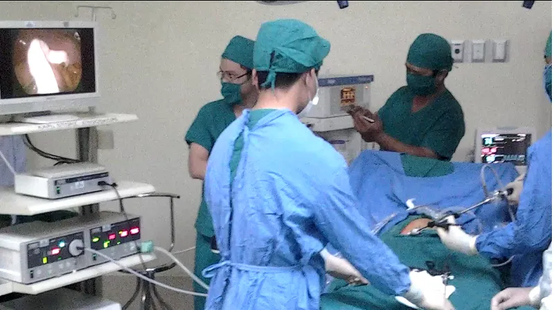 BS Đức Tuấn cho biết thêm: “Bé bị vỡ ruột thừa lâu ngày khiến phân tràn khắp ổ bụng, gây viêm nhiễm. Thông thường, các bác sĩ sẽ yêu cầu mổ hở vì phương pháp này giúp phẫu thuật viên dễ dàng xác định vị trí ruột thừa bị vỡ và xử lý làm sạch ổ bụng. Tuy nhiên, ngoài việc bé mang sẹo, không thể vận động mạnh về sau, di chứng hậu phẫu có nguy cơ bị dính ruột, thoát vị thành bụng suốt đời nên các bác sĩ và quyết định mổ nội soi cho bé".