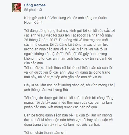 Toàn văn lời xin lỗi của chị Hằng trên Facebook cá nhân.