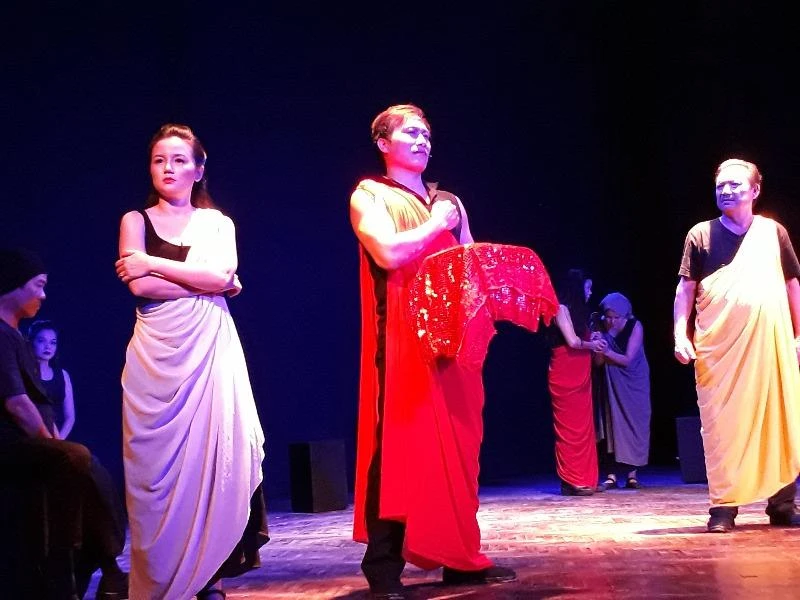 Đến lớp diễn của nhân vật nào, nhân vật ấy bước ra vị trí trung tâm để diễn. Các nhân vật còn lại lùi vào ngồi hai bên trên những chiếc bục vuông là những chiếc trống để gõ những âm thanh phụ trợ cho diễn viên, rất độc đáo và hiện đại. Họ cũng linh hoạt khi thì đóng vai này, khi thì đóng vai khác với những bộ trang phục tối giản nhưng vẫn đúng nhân vật, đúng chất cổ đại.