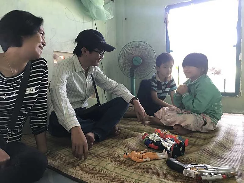 Mọi người đang tính toán chuyện xây nhà cho mẹ con Ngọc Hâng(ảnh trên). Cô giáo cũ của Hâng, nhà báo Đức Hiển cùng hai bé con của Hâng. Ảnh: MINH NAM