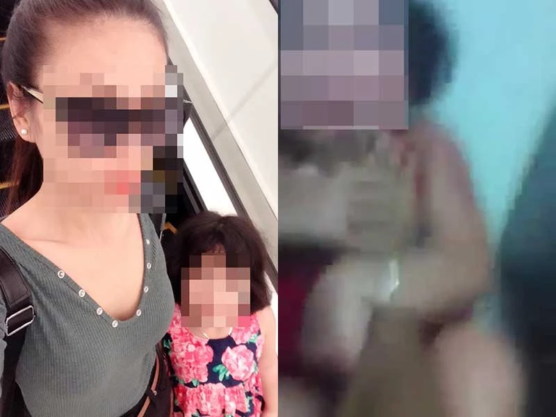 Hai mẹ con bà G. lúc đi chơi và hình ảnh lúc bà đạp bé rồi quay clip gửi cho người cha.