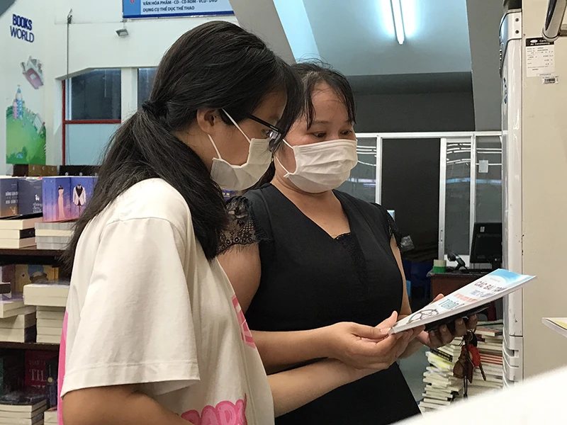 Phụ huynh tìm mua sách ôn luyện vào lớp 10 cho con tại một nhà sách ở TP Thủ Đức, TP.HCM. Ảnh: KHÁNH CHI