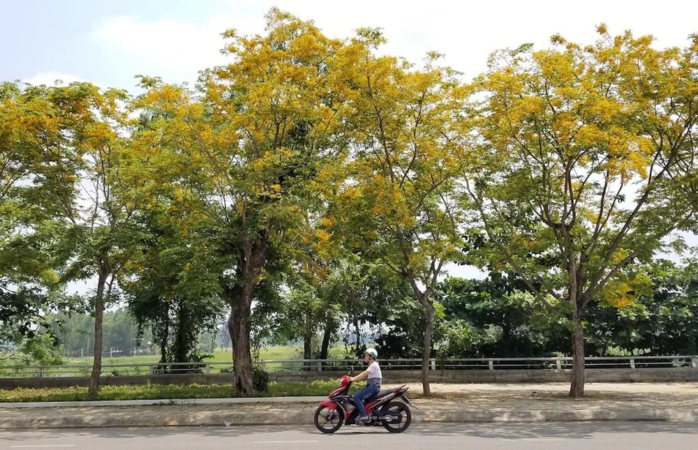 Con đường như khoác lên một màu áo mới. Sắc vàng của những hàng sưa tạo nên cảnh đẹp nao lòng. Ảnh : THANH NHẬT