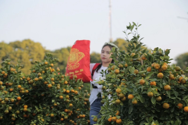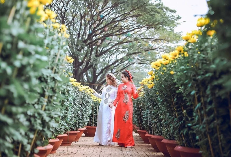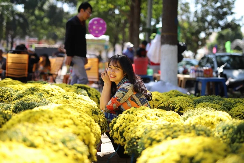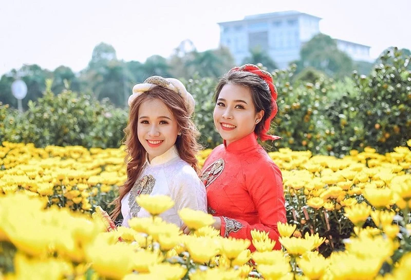 Bên cạnh sắc màu rực rỡ của hoa tết, nhiều cô gái trong trang phục áo dài truyền thống xuống phố.