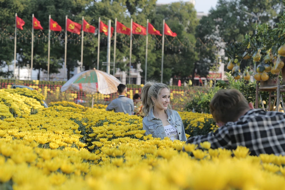 Nhiều gia đình đưa con cái đến quảng trường hoa để chụp ảnh, du xuân.