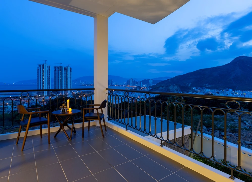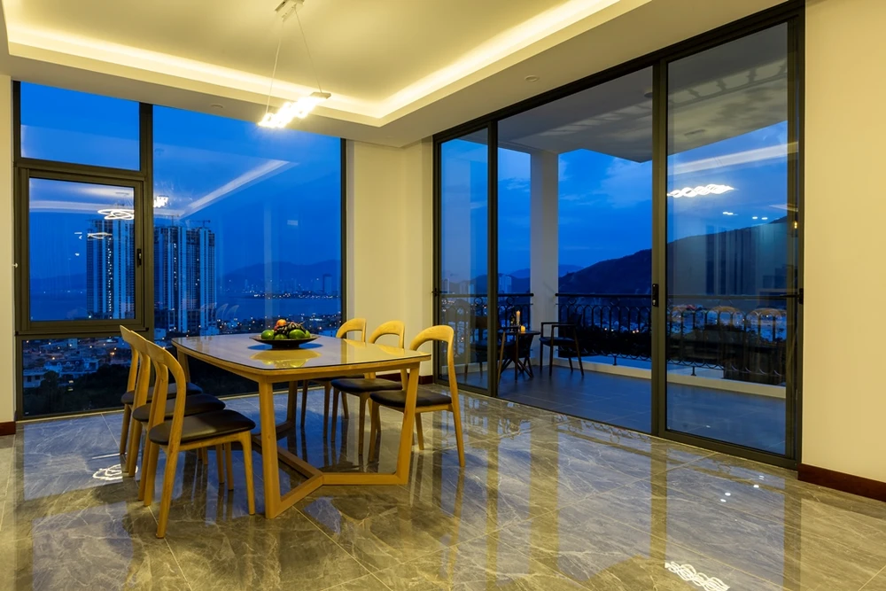 Khoảng sân phía trước kết hợp bàn ăn là không gian yêu thích của chủ nhà, nhất là lúc chiều về ngăm nhìn thành phố về đêm bên cạnh mặt biển thật lung linh.