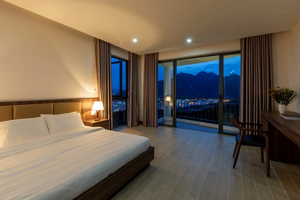 Nếu như không gian phòng khách được mở rộng thông thoáng hòa hợp cùng thiên nhiên thì phòng ngủ lại được bố trí kín đáo cùng với view nhìn lý tưởng .