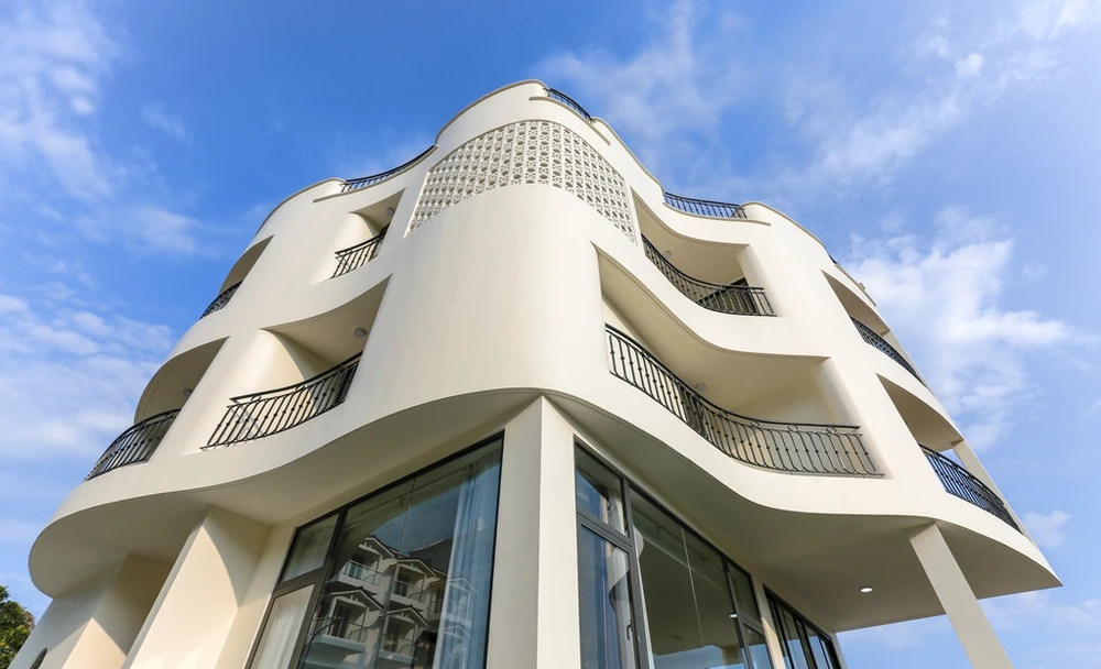 Điều đầu tiên gây ấn tượng nhất về công trình là hình dáng bên ngoài với những đường cong uốn lượn nhưng vững chãi hài hòa với những con đường quanh co, bãi biển dài cát trắng cùng với những ngọn núi hung vĩ.