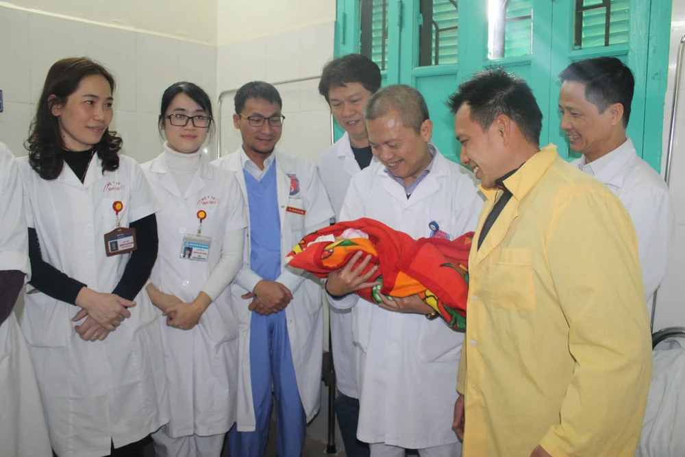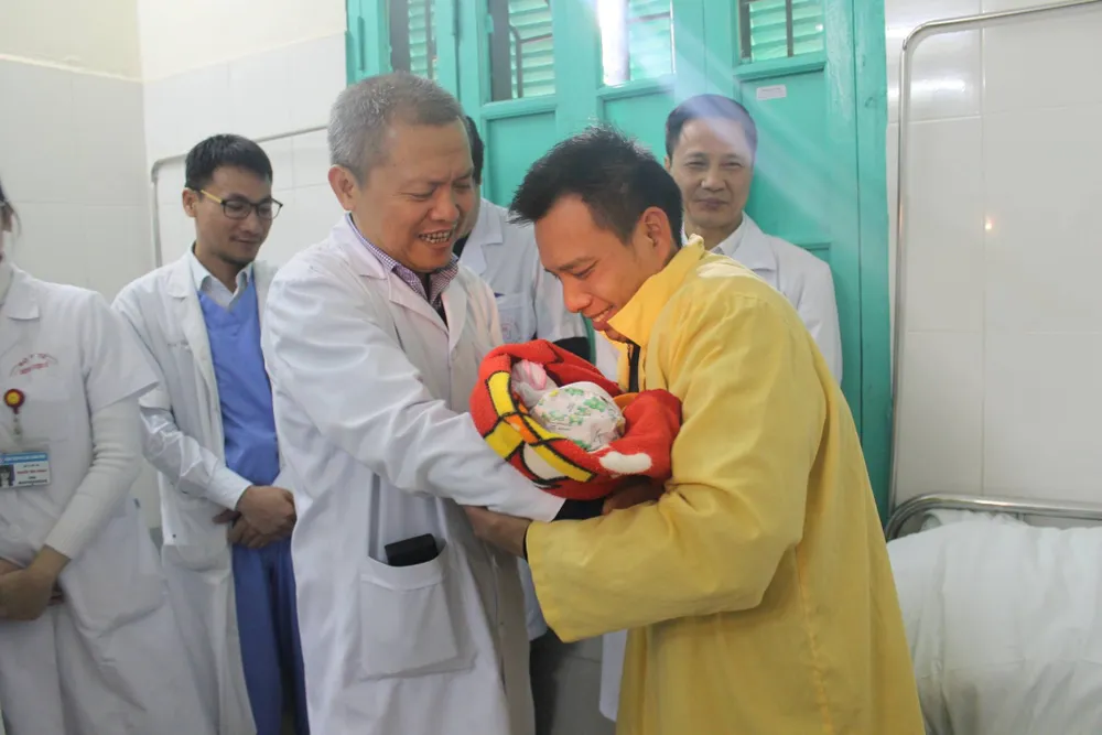 GS. Thành, Giám đốc BV E trao em bé mới sinh cho gia đình sản phụ
