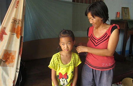 Mỏng thích thắt bím tóc cho con. Ảnh: H.MINH