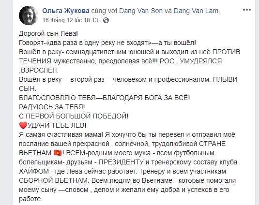 Trên Facebook cá nhân của mình, bà Olga Zhukova, mẹ thủ môn Đặng Văn Lâm, viết: