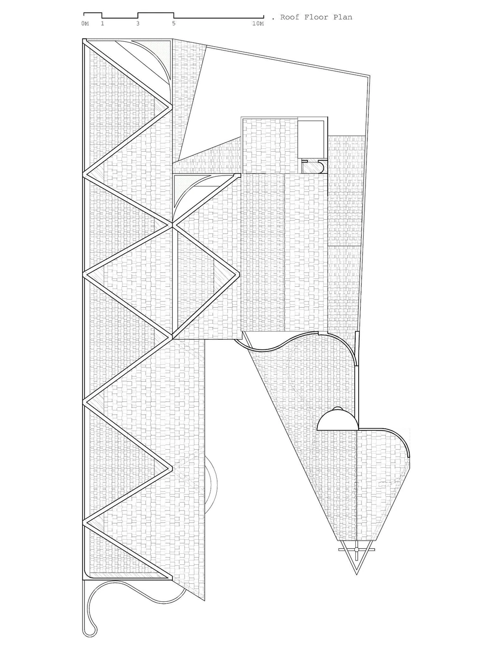 | Phần mái nhà phòng hội trường được đặt chéo 45 độ, đan xen với mái ngói của ngôi nhà cũ. |