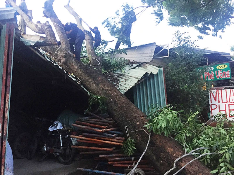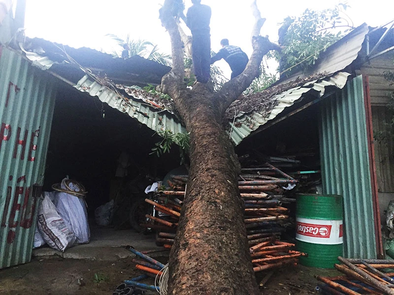 Cây ngã đè trúng cơ sở thu mua phế liệu bên dưới. Ngoài ra nhánh cây còn đập vào 1 phần mái của quán cà phê liền kề.