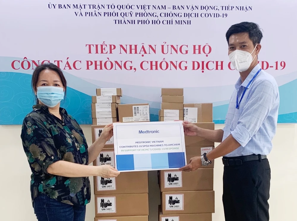 Trước đó, vào tháng 7, công ty đã hỗ trợ 5.000 bộ test kit xét nghiệm nhanh cho Ủy ban MTTQ Việt Nam TP.HCM để hỗ trợ công tác xét nghiệm và truy vết nhanh. Đặc biệt, nhằm hỗ trợ các bệnh viện tuyến đầu điều trị bệnh nhân COVID-19, Medtronic cũng trao tặng 10 máy và cảm biến đo nồng độ bão hòa oxy máu SPO2 cho BV Trưng Vương và BV Bệnh Nhiệt đới Trung ương thông qua Hiệp hội Thương mại Mỹ tại Việt Nam (AmCham Vietnam).