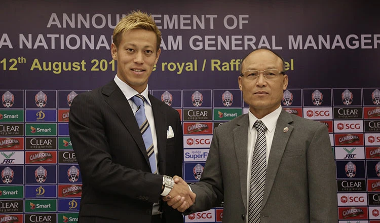 Honda cùng chủ tịch LĐBĐ Campuchia Sao Sokha trong lễ ký kết hợp đồng làm "tổng quản" tuyển Campuchia.
